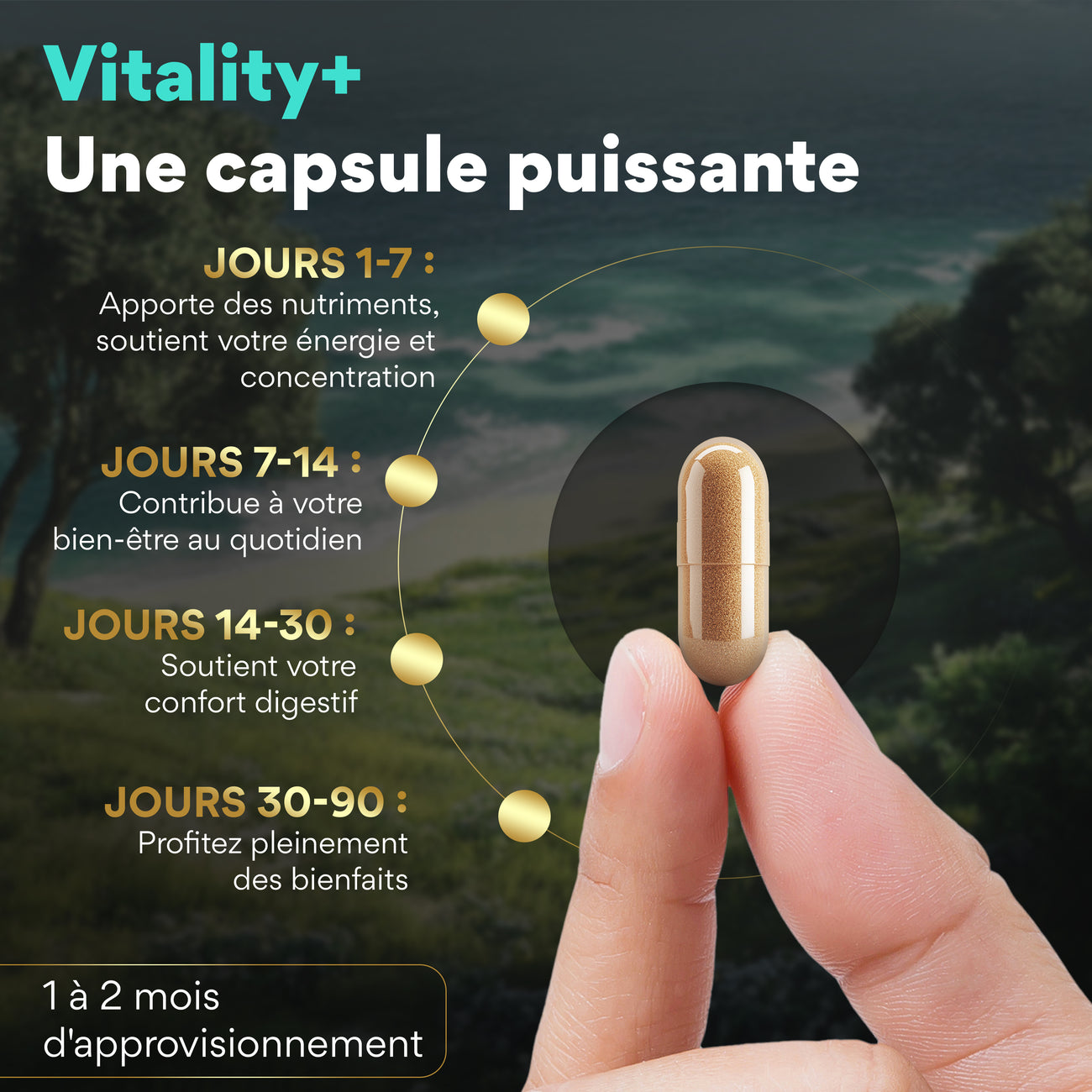 - Vitality+ agit en douceur, dès la première prise, pour soutenir votre énergie naturelle et votre digestion.